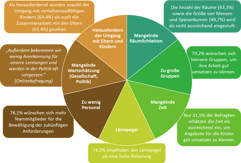 Die Beschäftigten sind im Arbeitsalltag und -feld mit vielfältigen, häufig miteinander verschränkten, Herausforderungen konfrontiert: Mangelnde und zu kleine Räumlichkeiten, zu große Gruppen, körperliche und mentale Belastung durch hohe Belastungen und Lärmpegel sowie mangelnde Zeit- und Personalressourcen. Auch externe Faktoren wirken belastend auf das Personal, wie bspw. die als gering wahrgenommene Wertschätzung seitens Gesellschaft und Politik für ihre Arbeit und der zunehmend als herausfordernd wahrgenommene Umgang mit Eltern und Kindern.