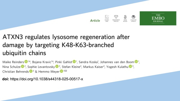 In collaboration within the framework of CRC 1430, Prof. Hemmo Meyer's group, together with the ICCE, used a variety of microscopic approaches to uncover the critical role of ATXN3 in restoring lysosomal function after lysosomal membrane damage. Additionally, they uncovered K48-K63-branched ubiquitin chain-regulated regeneration as a critical element of the lysosomal damage stress response.