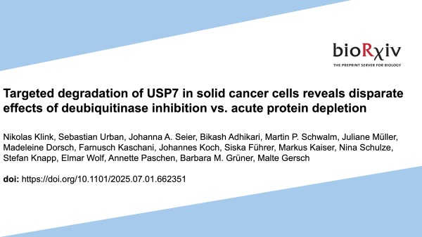 As part of a strong collaborative effort within CRC 1430, the ICCE supported the labs of Prof. Barbara M. Grüner, Prof. Annette Paschen, and Dr. Malte Gersch, who established a strategy to selectively degrade the deubiquitinase USP7 in melanoma and pancreatic cancer cells using highly specific PROTACs. The study revealed distinct cellular responses to USP7 degradation versus inhibition, emphasising the potential of PROTACs to dissect the catalytic and non-catalytic functions of DUBs in cancer.