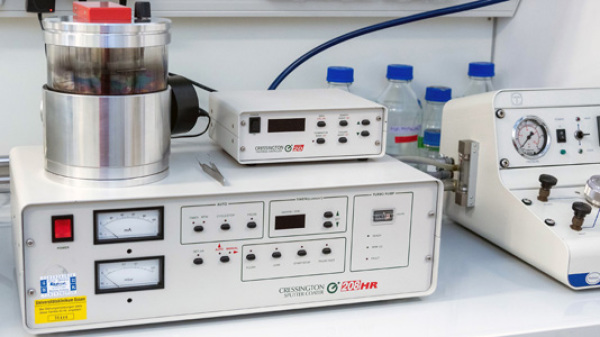 Bei einigen Proben ist es sinnvoll diese mit diesem Gerät mit einen hauchdünnen Kohlenstoff-Film zu überziehen bevor man sie im Rasterelektronenmikroskop untersucht. Dieser Sputter-Coater wird ausschließlich dafür verwendet.