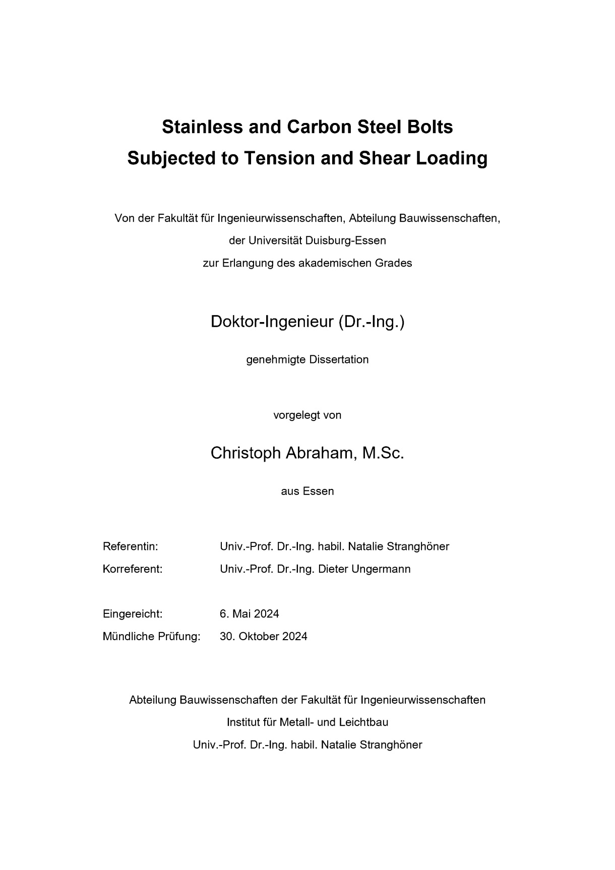 - Jakubowski, Alexander (2003): Ermüdungssichere Bemessung geschraubter Ringflanschstöße in turmartigen Stahlbauten unter besonderer Berücksichtigung von Flanschimperfektionen. Dissertation. Universität Essen, Cuvillier Verlag Göttingen, Essen, ISBN 978-3898736725