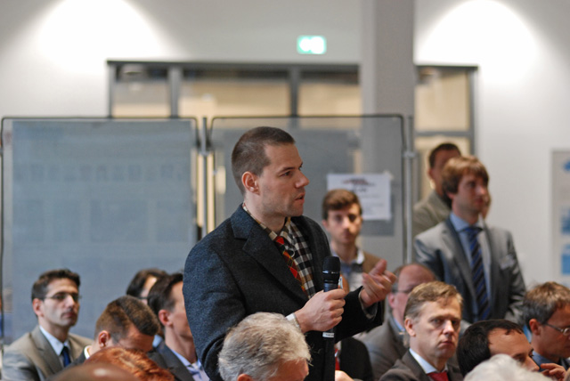 Als Abschlussredner präsentierte Dr. Martin Synold innovative Projektideen zum Bauen mit Stoff, die derzeit an seinen Wirkungsstätten am Institut für Leichtbau Entwerfen und Konstruieren (ILEK) der Universität Stuttgart und dem Ingenieurbüro Werner Sobek entwickelt werden. Neben aktuell in der Verwirklichung befindlichen Projekten gab er auch einen Ausblick auf das Bauen mit innovativen Materialien, die beispielsweise Sensorik oder textile Aktuatoren beinhalten können.
