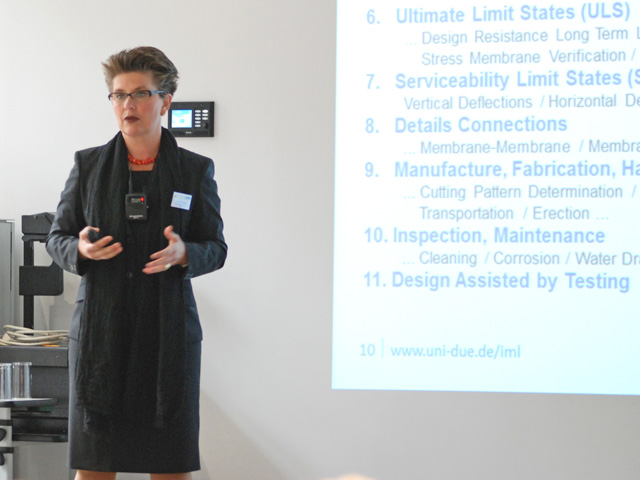 Die derzeitigen Bemühungen zur europaweiten Harmonisierung der Membranbaubemessung mit dem Ziel eines neuen Eurocodes für den Membranbau wurden von Prof. Natalie Stranghöner (Universität Duisburg-Essen, Institut für Metall- und Leichtbau) vorgestellt, die nicht nur Mitglied des europäischen Normenausschusses CEN/TC250 WG5 ist, sondern auch Federführende des deutschen Spiegelausschusses. Derzeit wird ein Hintergrundbericht erarbeitet, der als Grundlage für die Entwicklung des Eurocodes dienen soll. Frau Stranghöner stellte den Anwesenden die geplante Struktur und Inhalte sowie den Zeitplan für die Erstellung der neuen Bemessungsnorm vor.