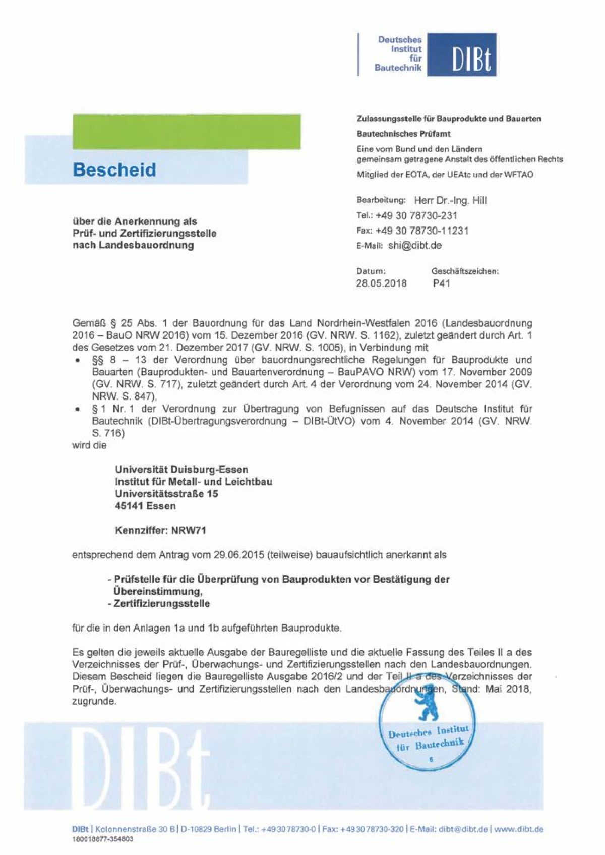Juni 2018Institut für Metall- und Leichtbau vom DIBt als Prüf- und Zertifizierungsstelle anerkannt