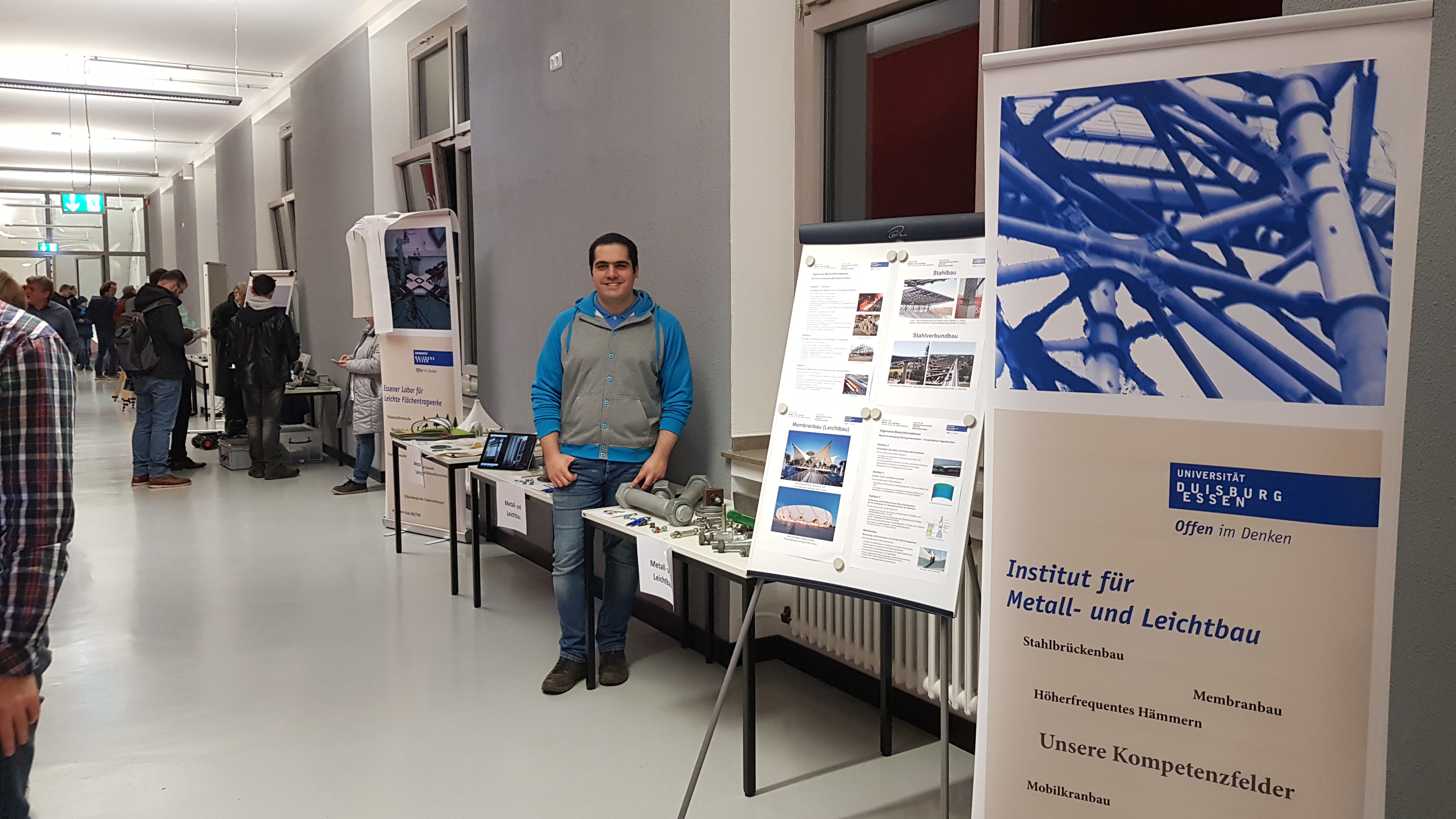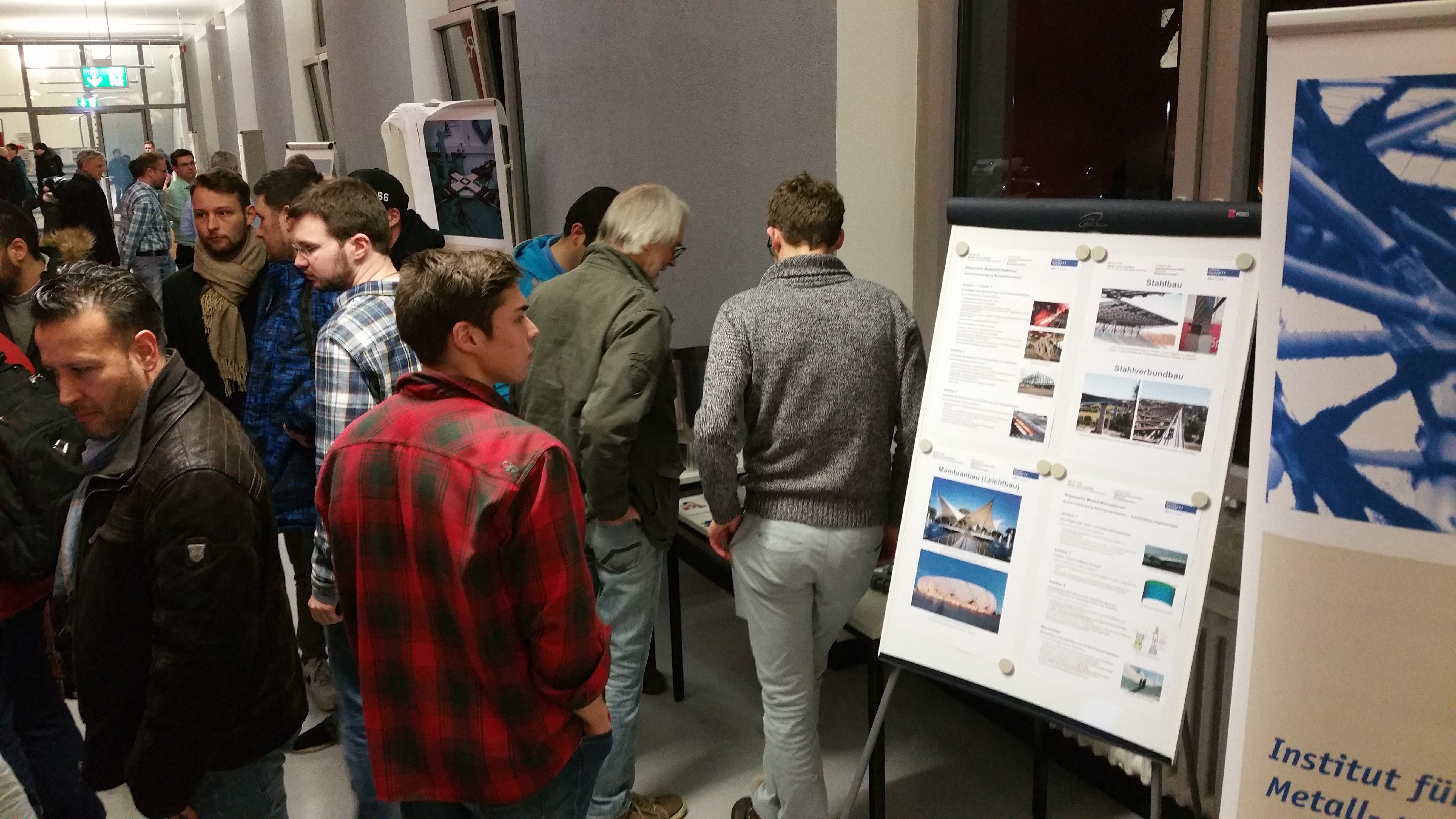Das Institut für Metall- und Leichtbau wurde vor Ort von den Mitarbeitern Sebastian Stehr M.Sc., Nariman Afzali M.Sc. und Tobias Kuhn, B.Sc. präsentiert, die Exponate aus dem Stahlbau wie verschiedene Schrauben der Durchmesser M12 bis M64 und verformte Schalenprüfkörper sowie eine Miniaturausgabe eines Membranbauprojektes, verschiedene Probemuster von Leichtbaumaterialien und Videos von Membran- und Folienreißversuchen sowie Zugversuchen an Gewindestangen zeigen und erklären konnten.