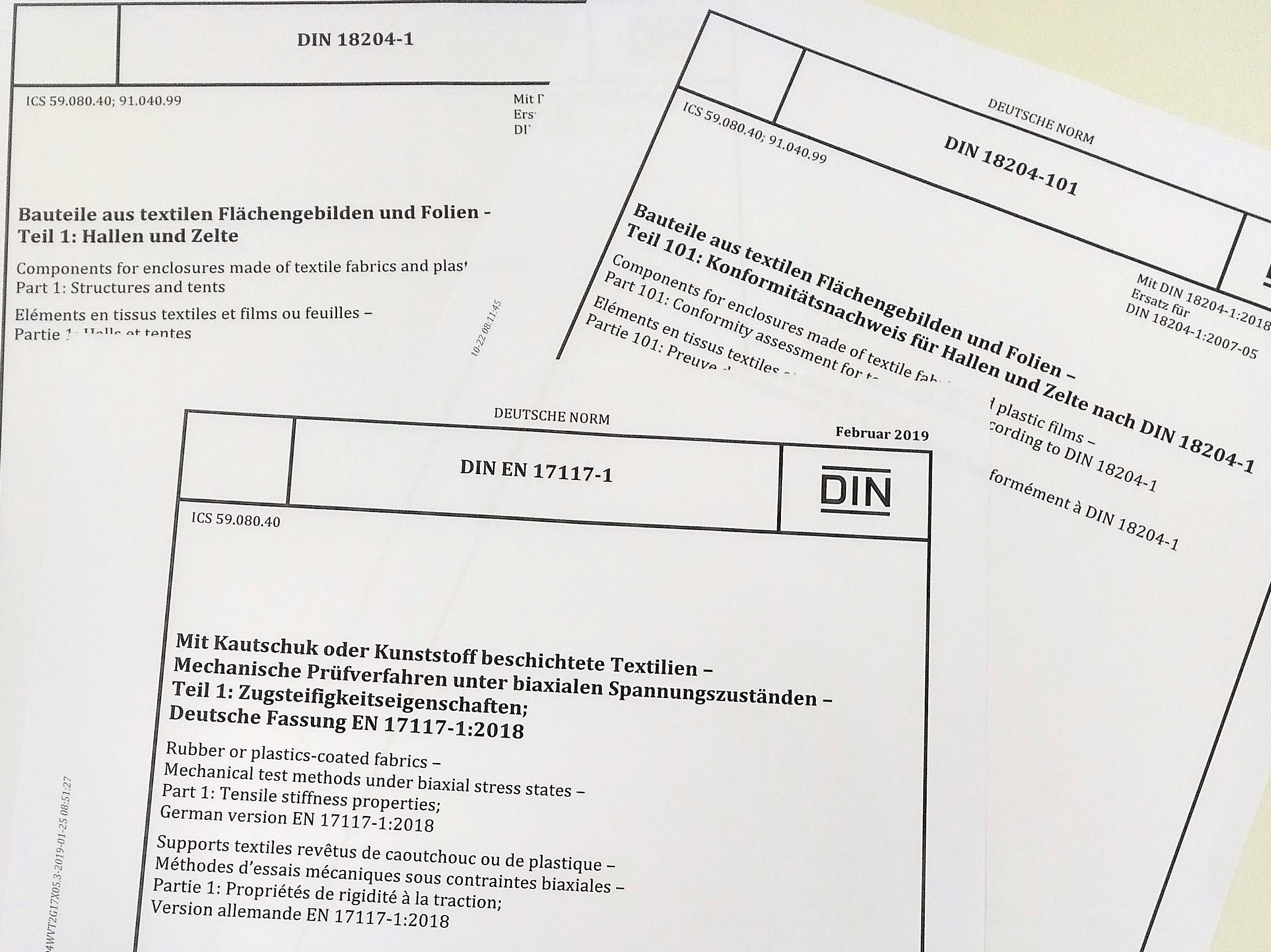 Die Normenreihe DIN 18204 „Bauteile aus textilen Flächengebilden und Folien“ wurde in den letzten zwei Jahren umfassend überarbeitet. Neben der Aktualisierung von Normenbezügen wurde die Struktur grundlegend geändert, so dass sie in zukünftig zu entwickelnden weiteren Normenteilen neben den Zelthallen weitere Strukturen aus textilen Flächengebilden und Folien regeln kann. Die Materialspezifikationen wurden entschlackt und auf neue Prüfnormen angepasst. Des Weiteren wurde das Bemessungskonzept behutsam überarbeitet. Derzeit liegen zwei Teile der Normenreihe DIN 18204 vor: DIN 18204-1:2018-11 „Bauteile aus textilen Flächengebilden und Folien – Teil 1: Hallen und Zelte“ und DIN 18204-101:2018-11 „Bauteile aus textilen Flächengebilden und Folien – Teil 101: Konformitätsnachweis für Hallen und Zelte nach DIN 18204-1“. Ein detaillierter Bericht zu den Änderungen gegenüber der Vorgängerfassung wurde von Dr. Jörg Uhlemann und Prof. Dr. Natalie Stranghöner veröffentlicht.