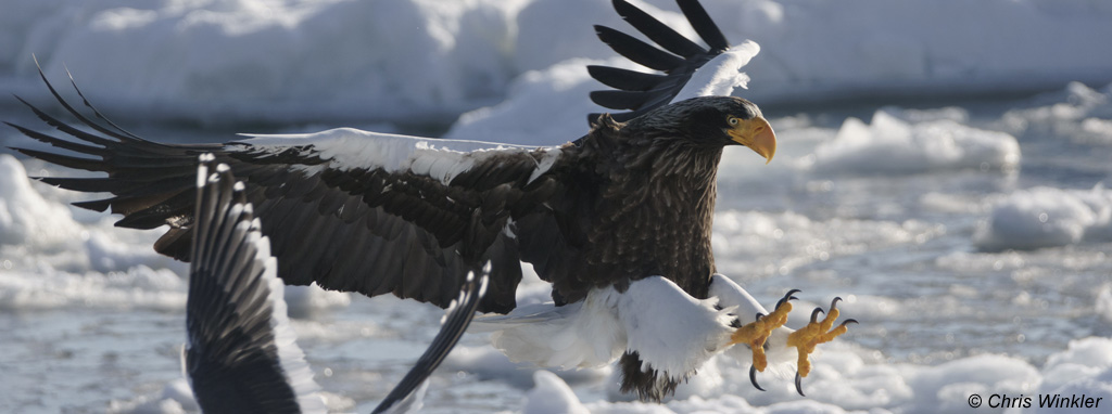 - Der Riesenseeadler (Japanisch: ōwashi) gilt als gefährdet. Diese beeindruckenden Greifvögel (mit einer Flügelspannweite von bis zu 2,5 m) verbringen die meiste Zeit an den Flussläufen und der Küste Sibiriens. In großer Zahl sind sie nur von Oktober bis März in Hokkaido anzutreffen. Die Mehrzahl der Tiere überwintert an der Ostküste Hokkaidos, vor allem in der Gegend um die Halbinsel Shiretoko, wo die hier gezeigten Bilder entstanden sind.