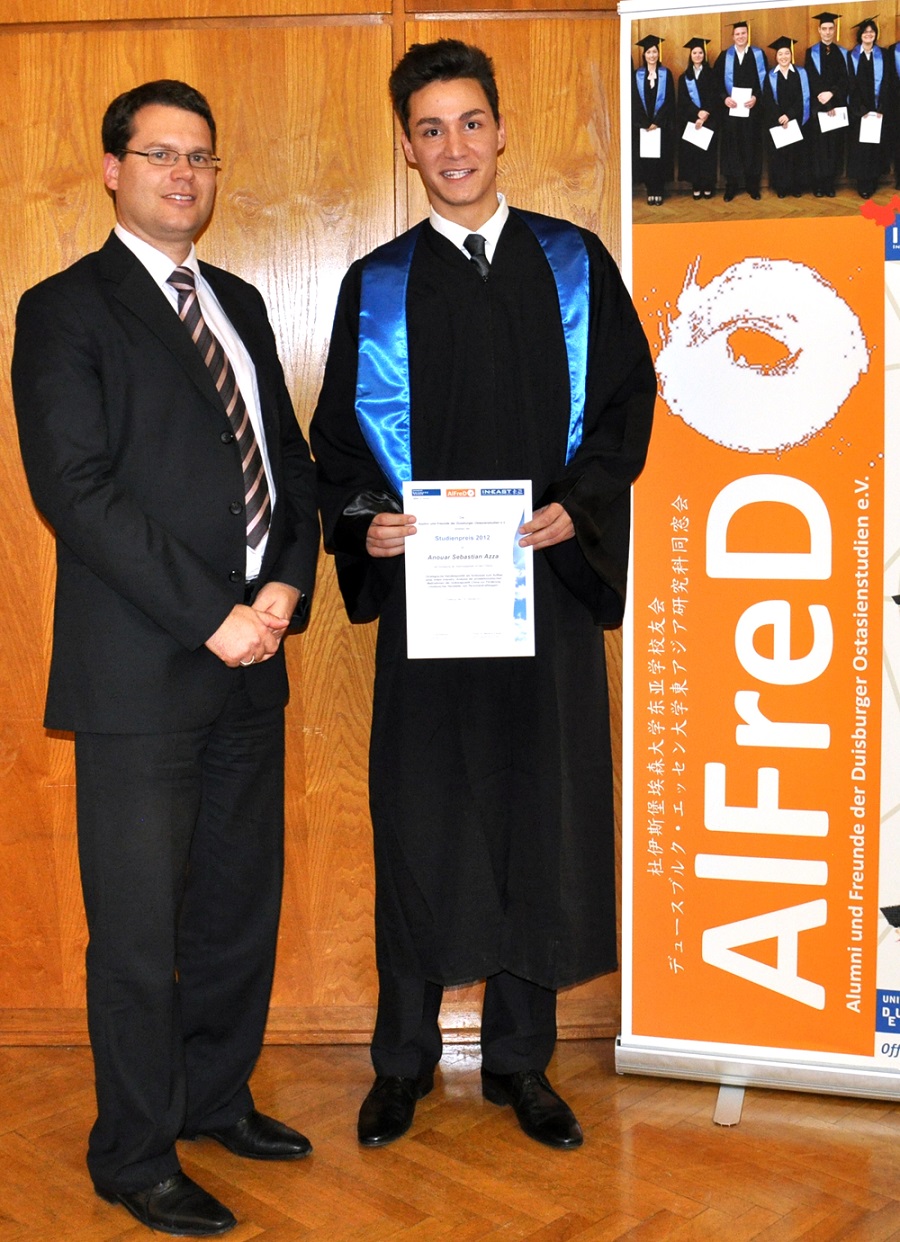 Der Alumni-Verein AlFreDO verlieh auch dieses Jahr wieder den AlFreDO-Studienpreis für die beste Abschlussarbeit. Der Vorsitzende Dirk Petzold überreichte den Preis an Anouar Sebastian Azza für seine Diplomarbeit "Strategische Handelspolitik als Schlüssel zum Aufbau einer Infant Industry: Analyse der protektionistischen Maßnahmen der Volksrepublik China zur Förderung chinesischer Hersteller von Personenkraftwagen".