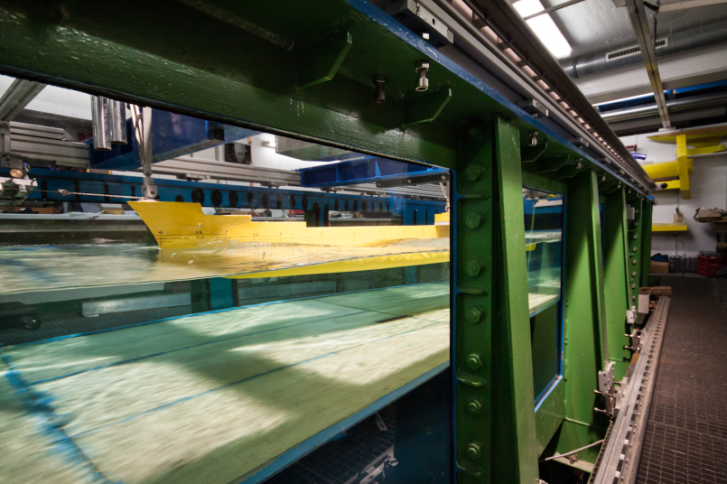 Das INAM ist mit einer eigenen Versuchseinrichtung ausgestattet, in der die Studierenden Einblick in die Modellversuchstechnik und die Bewertung von Schiffs- und Propellergeometrien gewinnen können.