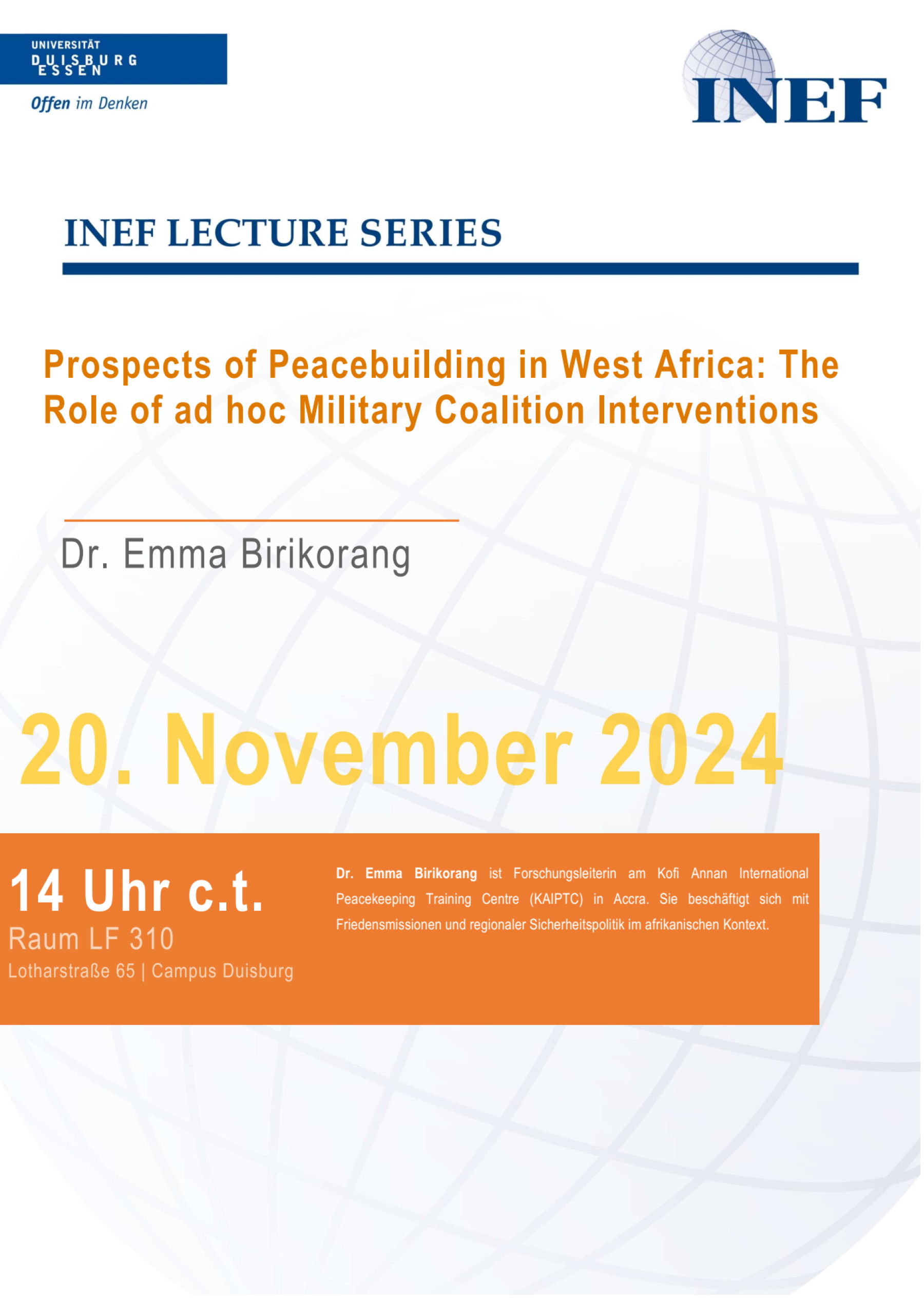 Am 20. November 2024 setzte Dr. Emma Birikorang mit einem Vortrag zum Thema "Prospects of Peacebuilding in West Africa. The Role of ad hoc Military Coalition Interventions" die INEF Lecture Series fort. Dr. Birikorang ist Forschungsleiterin am Peacekeeping Training Centre (KAIPTC) in Accra. Sie beschäftigt sich mit Friedensmissionen und regionaler Sicherheitspolitik im afrikanischen Kontext.