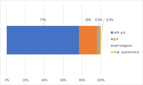 Überall dort, wo studentische Tutor*innen im Mentoring tätig sind, wird ihre Arbeit im gewichteten Mittel seit dem Start des neuen Konzepts zu 96 % als gut oder sogar sehr gut bewertet, wobei die weitaus meisten Stimmen auf "sehr gut" entfallen: