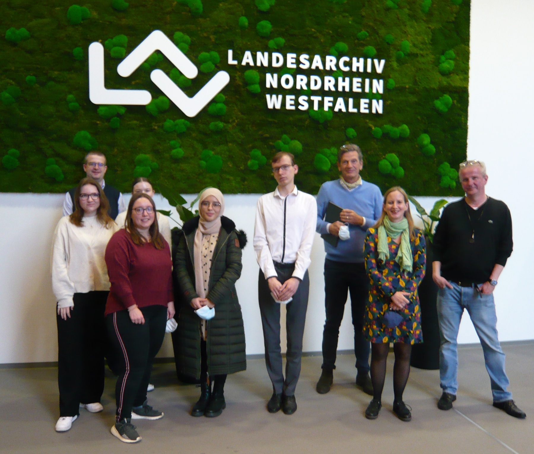 Abb.: Dr. Karoline Riener und Christoph Heinen mit dem Dozenten und den Studierenden im Hauptportal des Landesarchivs Nordrhein-Westfalen (Abteilung Rheinland) in Duisburg.