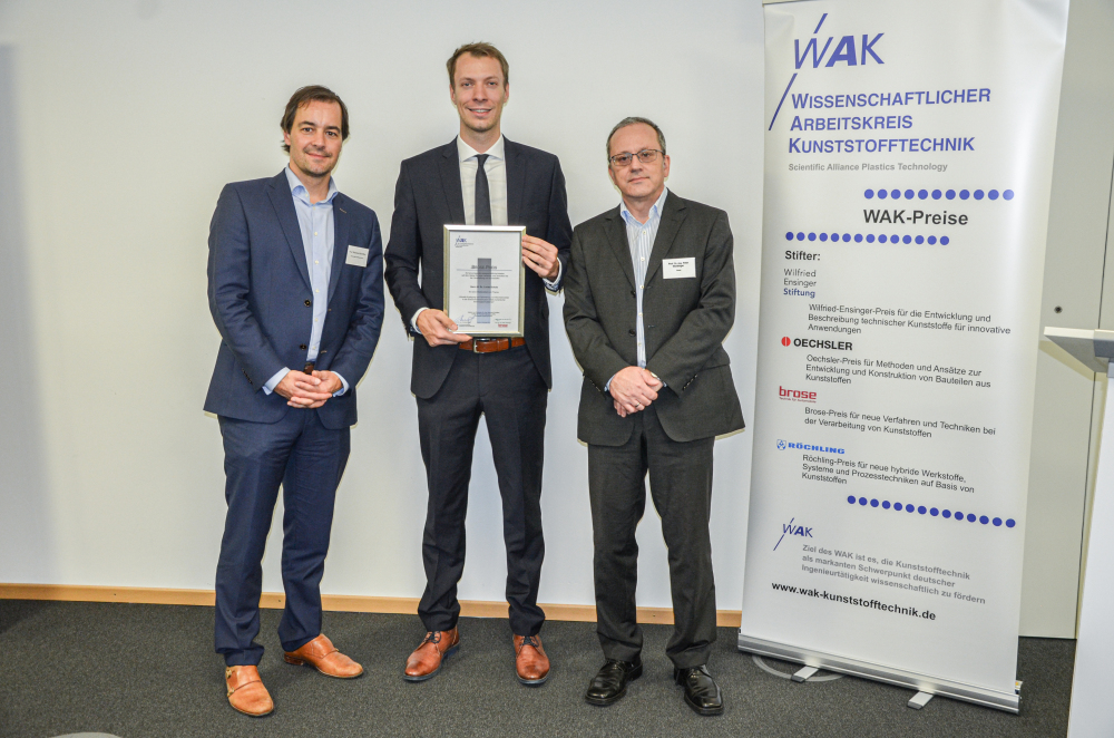 Der Lehrstuhl für Konstruktion und Kunststoffmaschinen gratuliert dem Gewinner des Brose Preises 2017 Herrn Mirco Janßen für seine erfolgreiche Masterarbeit mit dem Thema „Untersuchung der Entstehung von mikro- und nanoskaligen Randschichtstrukturen spritzgegossener Bauteile mittels Spritzgießsimulation und 3D-Oberflächenmesstechnik im Hinblick auf die Galvanik-Prozesskette“, verliehen durch den Wissenschaftlichen Arbeitskreis der Universitäts-Professoren der Kunststofftechnik (WAK).