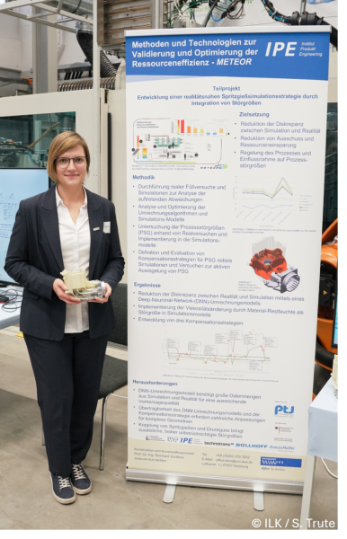 Im Zuge des Projektabschlusstreffens stellten alle Projektpartner aus Industrie und Forschung ihre Projektergebnisse vor. Darüber hinaus fand ein intensiver Austausch während der Institutsführung im ILK und der Abendveranstaltung statt. Am zweiten Tag lud das ILK zu einem Schaugießen in ihr Leichtbau-Validierungszentrum ein. Hier trafen sich nicht nur die Projektpartner der Projekte HyDrun und METEOR, sondern auch zahlreiche Fachleute aus der Aluminium-Druckgusstechnik und der Kunststoff-Spritzgießtechnik. Im Rahmen dieses Netzwerktreffens präsentierte Pia Wistuba im Namen des IPE der Universität Duisburg-Essen die während der vierjährigen Projektlaufzeit generierten Ergebnisse. Dabei lag der Fokus auf realitätsnahen Spritzgießsimulationen und innovativen Regelungsstrategien zur Kompensation von Störgrößen im Spritzgießprozess mithilfe maschineller Lernverfahren.