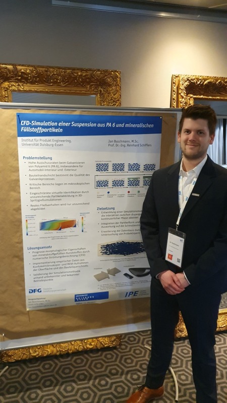 Auf der diesjährigen 40.-ten Ausgabe der PPS (Polymer Processing Society) Konferenz hatte Jan Buschmann die Gelegenheit aktuelle Forschungsergebnisse vor einem internationalen Fachpublikum vorzustellen. In seiner Forschung beschäftigt er sich am IPE – Institut Produkt Engineering der Universität Duisburg-Essen mit der CFD-Simulation im mikroskopischen Bereich von galvanisierten Bauteilen. Dabei geht es vor allem um ein tieferes Prozessverständnis des Fließ- und Partikelverhaltens. Die vorgestellten Ergebnisse zeigen die Abhängigkeit der Oberfläche in Bezug auf Änderungen der Prozessparameter und geben einen Eindruck in das entwickelte Simulationsmodell. Fokus der Konferenz waren Nachhaltigkeit und Recycling, aber auch Innovative Technologien und deren Transfer von der Wissenschaft in die Industrie.
