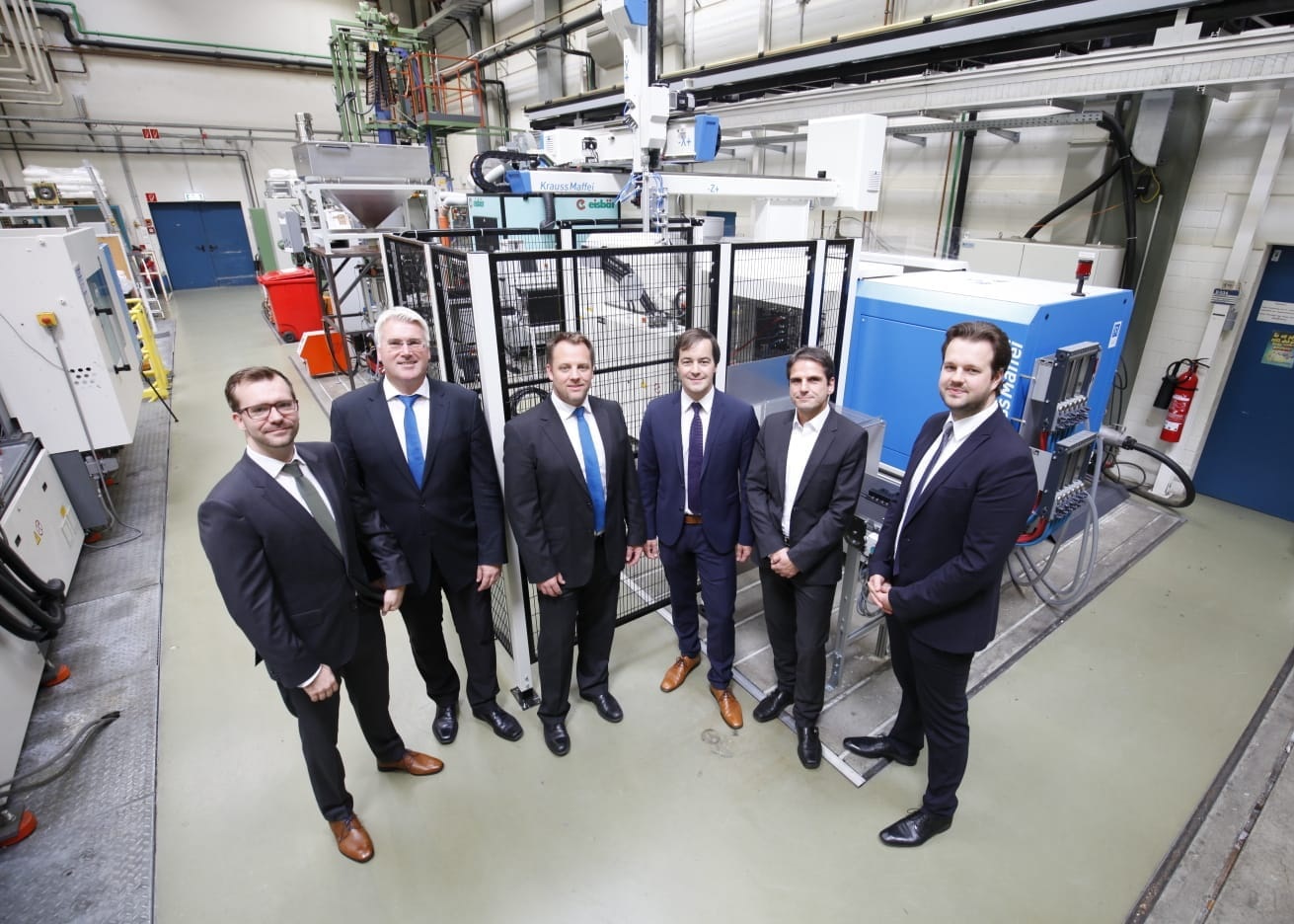 Bereits im Sommer konnten die Mitarbeiter des Lehrstuhls für Konstruktion und Kunststoffmaschinen ihre neue Spritzgießmaschine von Typ KraussMaffei PX 120-380 in Betrieb nehmen. Anfang Oktober 2018 wurde die Maschine nun offiziell übergeben. Hierzu ließen es sich Dr. Stefan Kruppa (Director Smart Machines), Dr. Daniel Ammer (Director Technologies), Martin Würtele (Leiter Technologieentwicklung) sowie Frank Dalhaus (Leiter Vertriebs- und Service Center Nord) nicht nehmen, persönlich nach Duisburg zu reisen.
