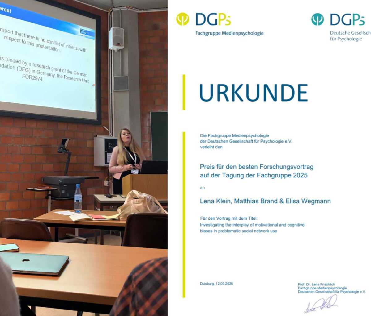 Lena Klein (PhD) represented the chair and presented the most recent research findings in the field of social networks, which were developed as part of subproject 8 of the ACSID FOR2974 research group. The corresponding abstract was evaluated in a review process and received the highest score of all submissions at the conference. Therefore, Lena Klein, Prof. Dr. Matthias Brand and Dr. Elisa Wegmann received the award for the best scientific presentation.
