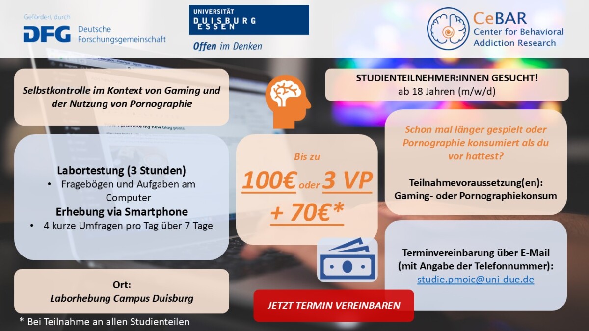 Im Rahmen einer überregionalen Forschungsgruppe (FOR2974) untersuchen wir verschiedene Arten der Internetnutzung. Ziel ist es, besser zu verstehen, warum Menschen bestimmte Internet-Anwendungen (z.B. social media oder Videospiele) nutzen - manchmal sogar mehr als beabsichtigt - und welche psychologischen Prozesse damit in Zusammenhang stehen könnten. Wir suchen dafür Freiwillige, die als Proband:in an unseren wissenschaftlichen Studien teilnehmen möchten. Eine Teilnahme an einer unserer Studien vergüten wir mit 12€ pro Stunde.