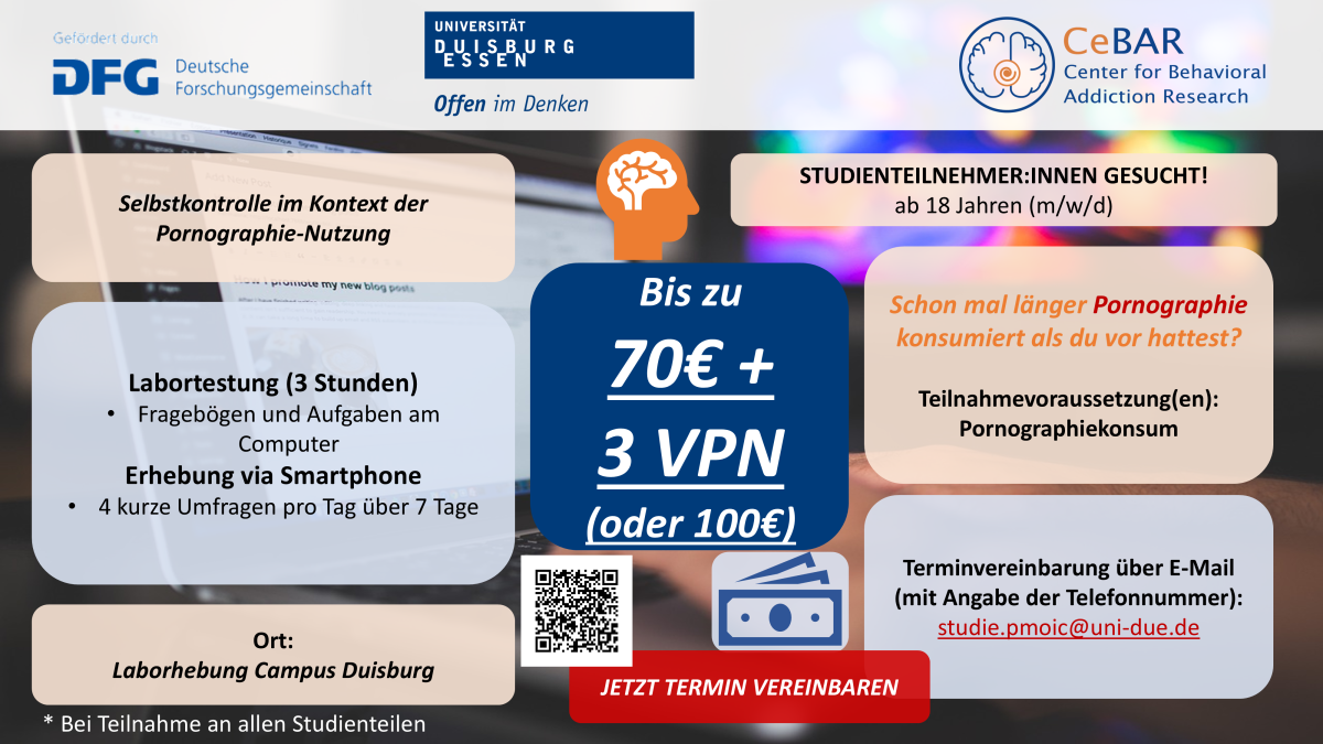 Im Rahmen einer überregionalen Forschungsgruppe (FOR2974) untersuchen wir verschiedene Arten der Internetnutzung. Ziel ist es, besser zu verstehen, warum Menschen bestimmte Internet-Anwendungen (z.B. social media oder Videospiele) nutzen - manchmal sogar mehr als beabsichtigt - und welche psychologischen Prozesse damit in Zusammenhang stehen könnten. Wir suchen dafür Freiwillige, die als Proband:in an unseren wissenschaftlichen Studien teilnehmen möchten. Eine Teilnahme an einer unserer Studien vergüten wir mit 12€ pro Stunde.