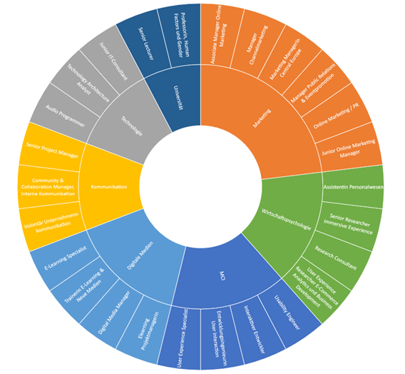Einen guten Einblick in einige exemplarische Berufsfelder gibt der Blog https://wearekomediablog.wordpress.com/, der im Rahmen einer Lehrveranstaltung von Studierenden konzipiert und entwickelt wurde. In kurzen Videosequenzen erzählen Absolventen des MIPSY-Studiengangs über ihre Erfahrungen mit dem Studium, ihre dort erlernten Fähigkeiten und ihren heutigen Berufsalltag. Unter dem Reiter „Absolventen/Innen“ findet sich die u.s. Grafik, die bisherige von MIPSY-Absolventen/innen ergriffene Berufsfelder darstellt.