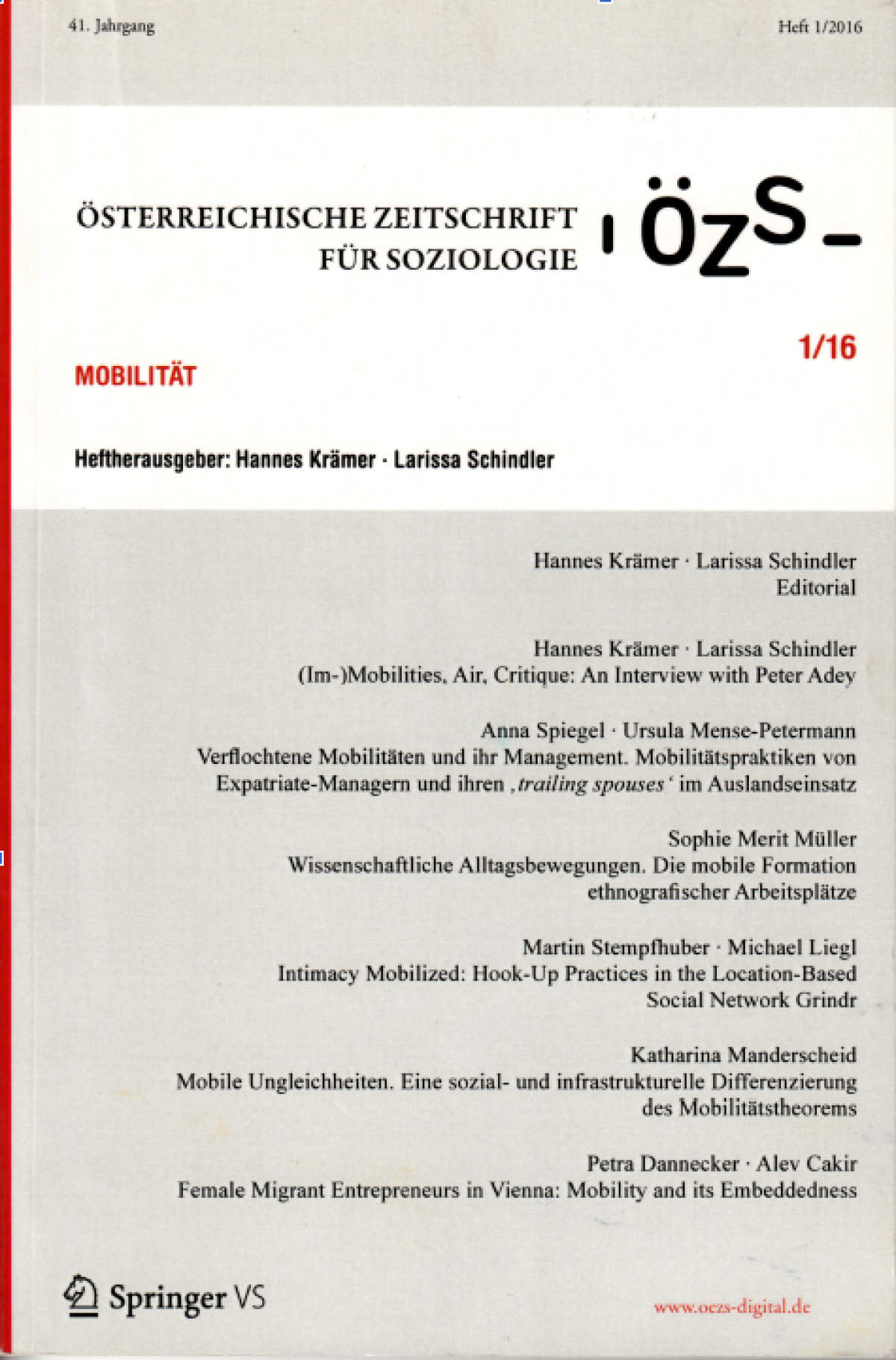 Editorial: Mobilität. In: Österreichische Zeitschrift für Soziologie 41(1). S. 1-4 (mit Larissa Schindler), https://link.springer.com/article/10.1007/s11614-016-0186-x, DOI: 10.1007/s11614-016-0186-x