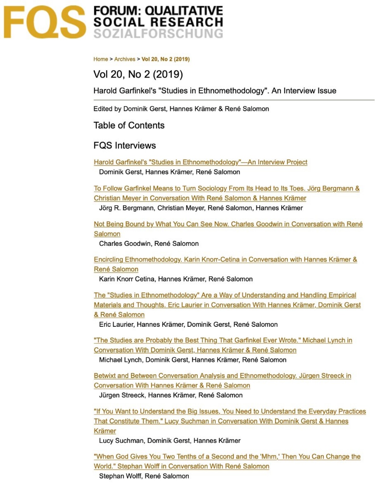 Harold Garfinkel's "Studies in Ethnomethodology". An Interview Issue. Schwerpunktausgabe Forum Qualitative Sozialforschung / Forum: Qualitative Social Research, 20(2) (mit Dominik Gerst und René Salomon),