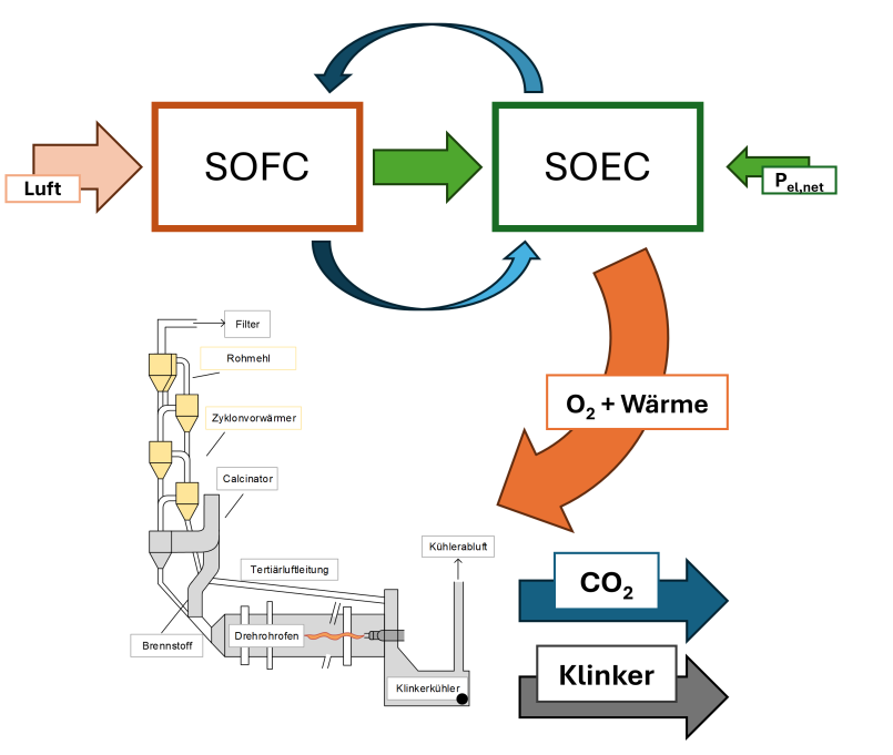 Das Forschungsprojekt „CEM-SOF-EC“ erforscht die innovative Kopplung von Hochtemperaturbrennstoffzellen (SOFC) und Hochtemperaturelektrolyseuren (SOEC) zur Bereitstellung von Sauerstoff. Diese Technologie ermöglicht eine effiziente Sauerstoffproduktion durch die Nutzung von Abwärme aus dem Produktionsprozess und elektrischer Energie. Der Sauerstoff wird dabei direkt in den Oxyfuel-Prozess integriert, wodurch eine hocheffiziente und kostengünstige CO2-Abscheidung im Zementbrennprozess möglich wird.