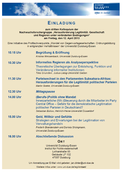 Am Freitag, den 12. April, findet das dritte Kolloquium der Nachwuchsforschergruppe "Herausforderung Legitimität. Gesellschaft und Regieren unter veränderten Bedingungen" statt. Im Mittelpunkt stehen diesmal informelle Institutionen, informelles Regieren und Verwaltungshandeln in jungen und etablierten Demokratien. Eine Übersicht über den geplanten Ablauf des Kolloquiums finden Sie hier.