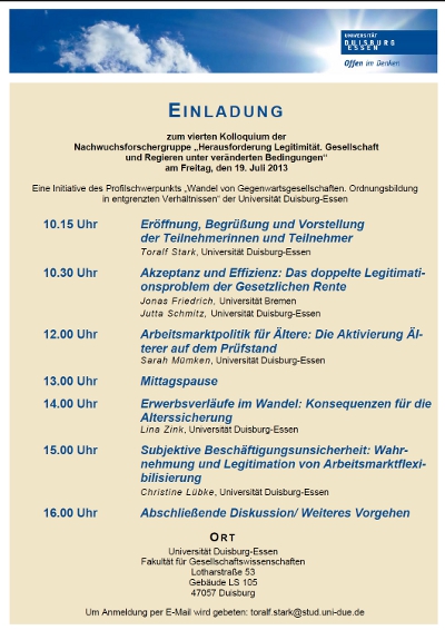 Unter der Leitung von Toralf Stark wurden insgesamt vier verschiedene Forschungsprojekte schwerpunktmäßig zum Themenbereich Arbeitsmarkt und Sozialpolitik diskutiert. Ein detaillierter Bericht zum Kolloquium vom 19. Juli 2013 findet sich im nächsten Newsletter des Profilschwerpunkts "Wandel von Gegenwartsgesellschaften".