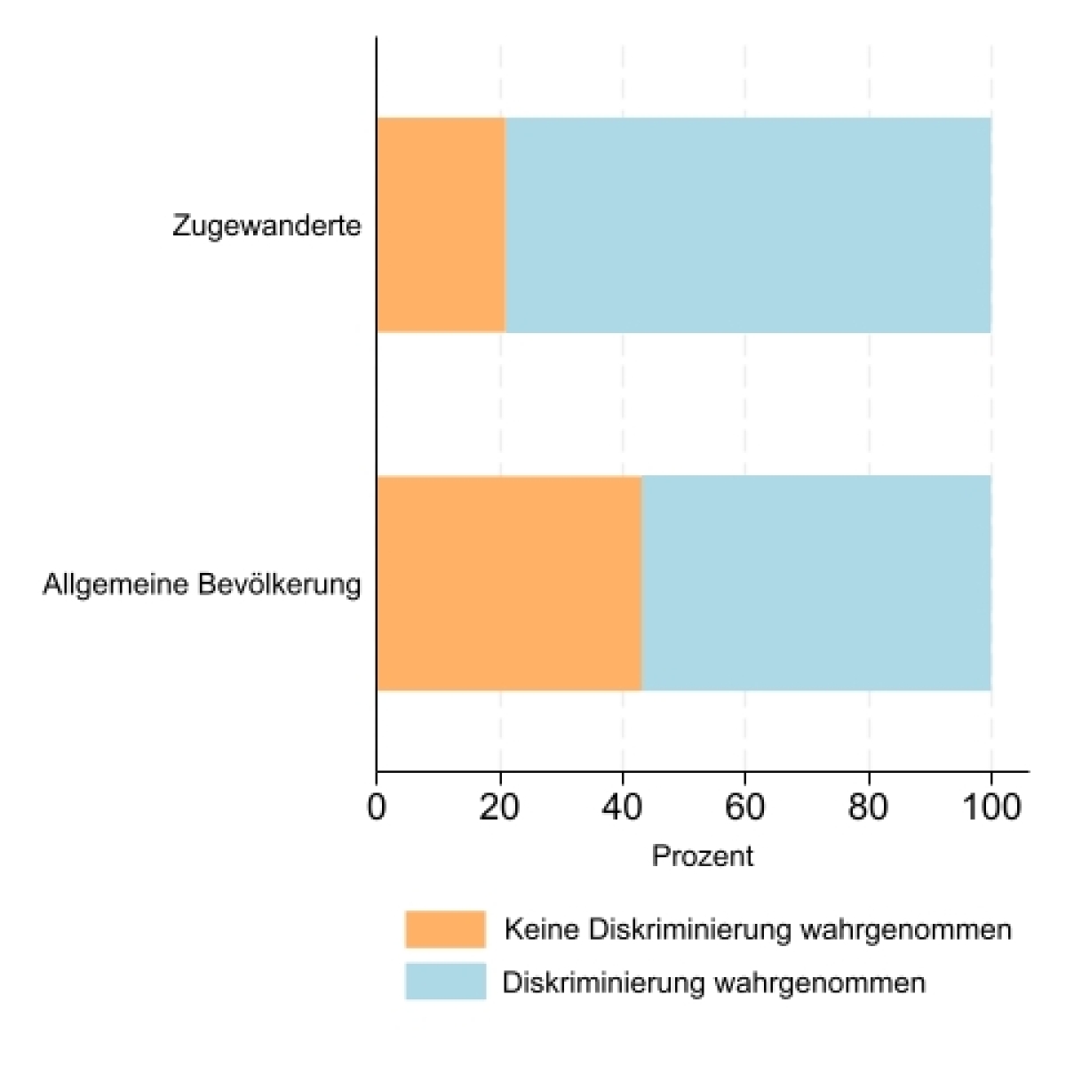 Die befragten Zugewanderten nehmen Diskriminierung deutlich häufiger wahr als die Befragte aus der allgemeinen Bevölkerung. Während aus der allgemeinen Bevölkerung rund 55% der Befragten angeben, schon einmal Diskriminierung erlebt zu haben, sind es bei den Zugewanderten drei Viertel (75%). Dieser große Unterschied ist vor allem darauf zurückzuführen, dass Zugewanderte häufiger von Diskriminierung aufgrund des ethnischen Hintergrundes und der Religionszugehörigkeit betroffen sind.