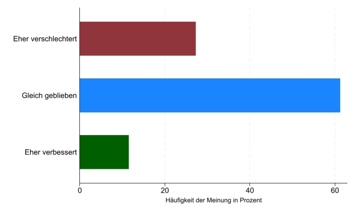 Die Corona-Pandemie hatte schwerwiegen Auswirkungen auf Gesellschaften weltweit. Die LiV-Umfrage zeigt jedoch, dass die Corona-Pandemie erfreulicherweise keinen großen Einfluss auf die Wahrnehmung des Zusammenhalts in der Nachbarschaft hatte. Für die Mehrheit der Befragten (61%) hat sich der Zusammenhalt in der Nachbarschaft durch die Corona-Pandemie nicht verändert. 11% der Befragten sehen sogar eine Verbesserung des sozialen Zusammenhalts, während 27% eine Verschlechterung des sozialen Zusammenhalts durch die Corona-Pandemie wahrnehmen.