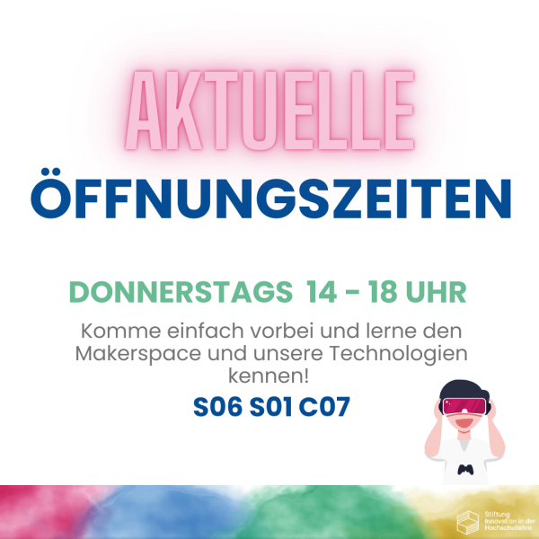 Für ein erstes Kennenlernen unserer Räumlichkeiten und Angebote und die eigenständige Umsetzung gibt es montags von 10:00-18:00 Uhr freie Öffnungszeiten. Hier können alle Interessierten ohne Voranmeldung vorbeikommen. Um unsere Geräte nutzen zu können, muss nur die allgemeine Sicherheitsunterweisung erfolgt sein. Unser Team steht zur Unterstützung gerne zur Verfügung.