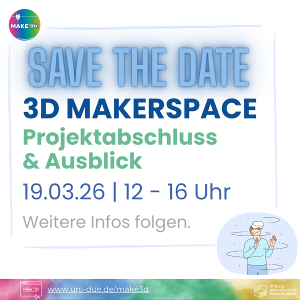 Am 19.03.2026 von 12–16 Uhr laden wir dich herzlich zum Projektabschluss & Ausblick im 3D Makerspace ein. Dich erwarten spannende Einblicke in unsere Projektergebnisse, interaktive Workshops sowie inspirierende Gastvorträge.