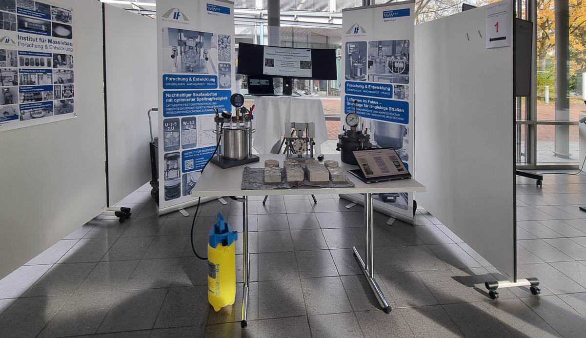 Das IfM stellte in diesem Jahr die Themen „Ressourcenschonender Straßenbeton: Steigerung der Festigkeit und Dauerhaftigkeit durch Anpassung der Rezeptur“ sowie „Alternative Prüfverfahren zur qualitativen Luftporenerfassung am Frischbeton“ vor. Präsentiert wurde eine Zusammenfassung zweier Forschungsprojekte im Bereich des Straßenbaus, die auf die Verbesserung der Nutzungsdauer und Nachhaltigkeit von Straßenbeton durch optimierte Materialzusammensetzung und innovative Prüftechnik abzielen. Zur Veranschaulichung wurden zukunftorientierte Prüfgeräte, Ausstellungsproben und informative Roll-ups eingesetzt, die das Publikum zum fachlichen Austausch anregten.