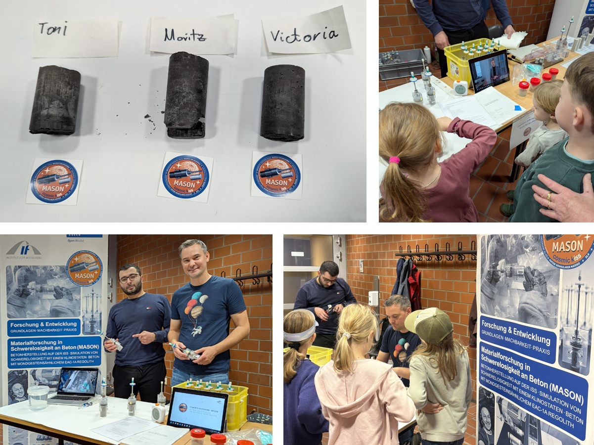 Über 30 Kinder durften dabei in die Rolle von ESA-Astronaut Matthias Maurer schlüpfen, der 2022 für unser Projekt MASON Betonproben auf der Internationalen Raumstation (ISS) hergestellt hatte. Genau wie Maurer damals konnten die Kinder mit dem gleichen MASON Concrete Mixer (MCM) ihre eigene kleine Betonprobe anmischen – ganz wie im All!