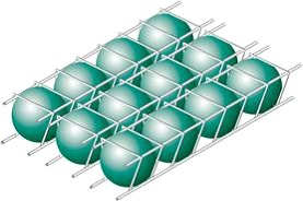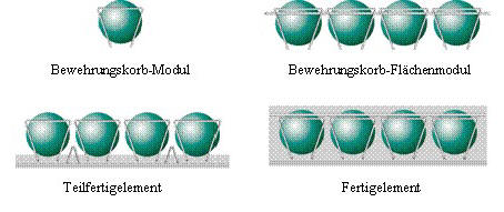 Das Prinzip dieser Decken besteht darin, Kunststoffhohlkörper in einer industriellen Vorfertigung herzustellen und diese als Bewehrungskorbmodule vorzufertigen. Diese Bewehrungskorbmodule können dann auf die untere tragende Bewehrung aufgesetzt werden. Anschließend wird die obere tragende Bewehrung auf die vorgefertigten Bewehrungskorbmodule aufgelegt.