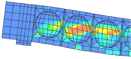 Der erste Versuchskörper jeder Serie wurde ohne Hohlkörper ausgebildet. Die Versuchergebnisse der massiven Platte konnten somit als direkter Vergleich für die Versuchsergebnisse der Hohlkörperdecken herangezogen werden. Sämtliche Versuchskörper wurden ohne Querkraftbewehrung hergestellt. Die Versagenslast wurde an einem Versuchsaufbau für einen Vier-Punkt-Biege-Versuch ermittelt. Die Versagensbilder der Versuche und dreidimensionaler Finite-Elemente-Berechnungen zeigen die Bilder 4 bis 6.