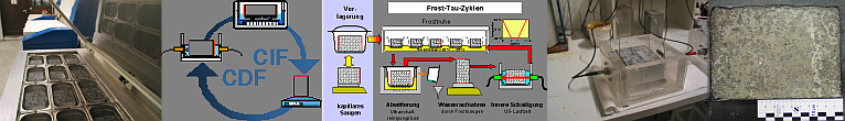 Der CDF-Test dient der Bestimmung der Oberflächenschädigung durch Frost-Tausalz-Angriff. Als Prüfmedium wird hierbei eine 3%-ige NaCl-Lösung verwendet. Der CIF-Test quantifiziert die innere Schädigung der Probekörper. Dabei dieser Art der Schädigung der Frostangriff dominiert wird als Prüflösung demineralisiertes Wasser eingesetzt.