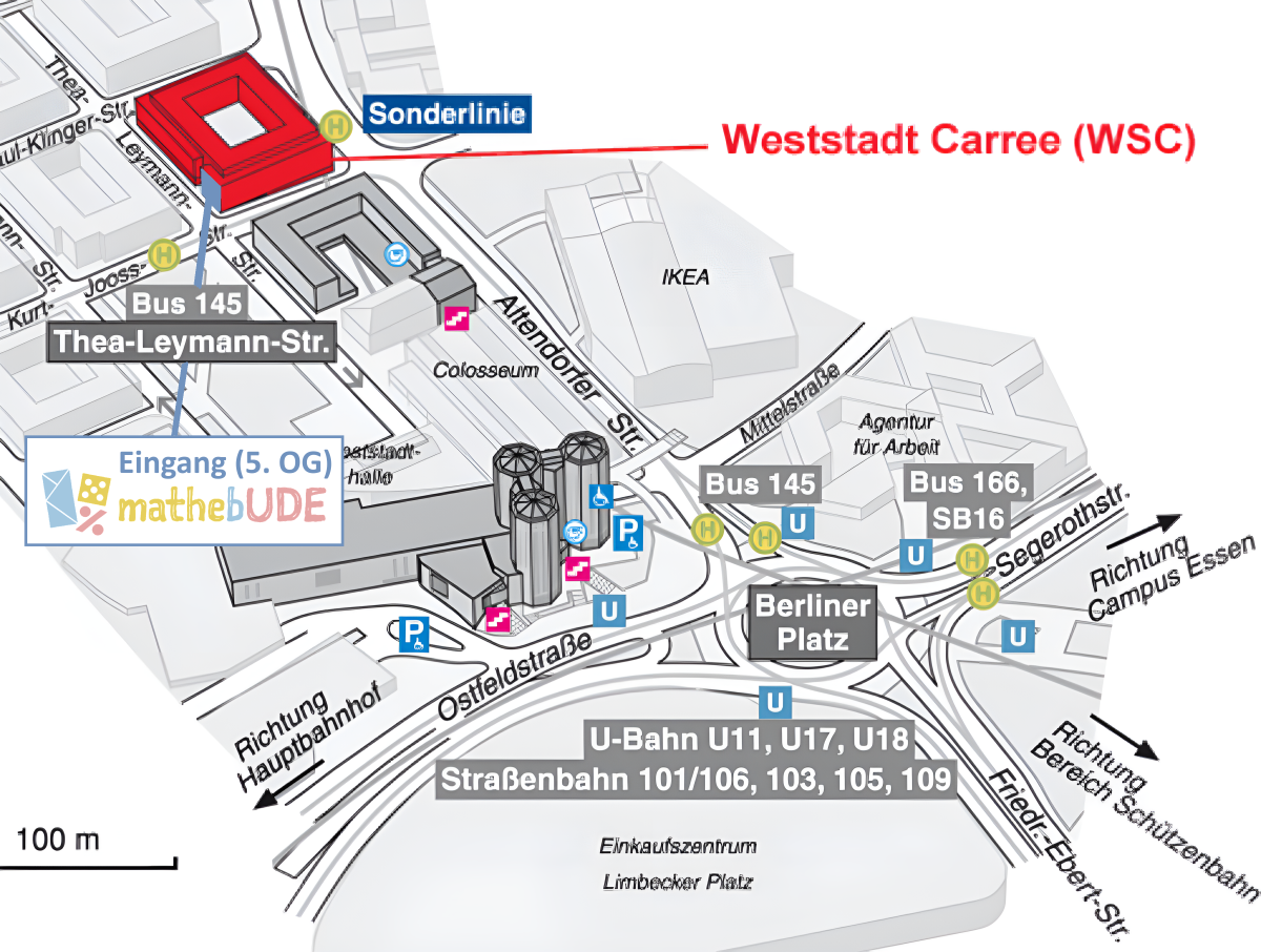 Aufgrund fehlender Parkmöglichkeiten am WSC empfehlen wir Ihnen mit öffentlichen Verkehrsmitteln anzureisen. Falls Sie dennoch mit dem Auto anreisen, stehen Ihnen am Campus Essen kostenlose Parkmöglichkeiten zur Verfügung (Fußweg ca. 20 Minuten, 1,5km).