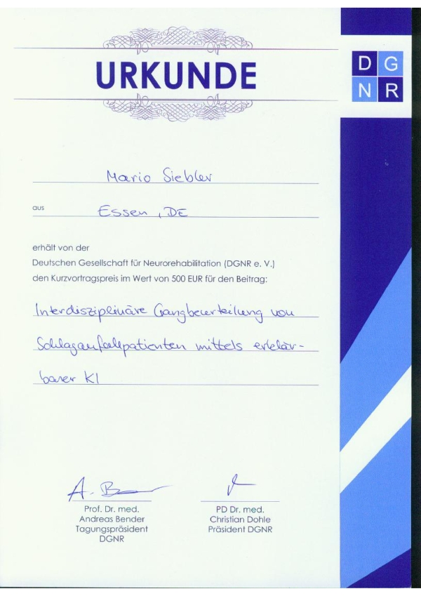 Der Beitrag "Interdisziplinäre Gangbeurteilung von Schlaganfallpatienten mittels erklärbarer KI – Ist ein fachlicher Austausch mit einem KI-Assistenzsystem denkbar?" von J.C. Liaw, D. Raab, M. Weber, H. Hefter, D. Zietz, M. Jäger, A. Kecskeméthy, F. Geu Flores und M. Siebler wurde auf der Jahrestagung der Deutschen Gesellschaft für Neurorehabilitation e.V. 2023 mit dem Kurzvortragspreis ausgezeichnet. Vortragender war Mario Siebler.
