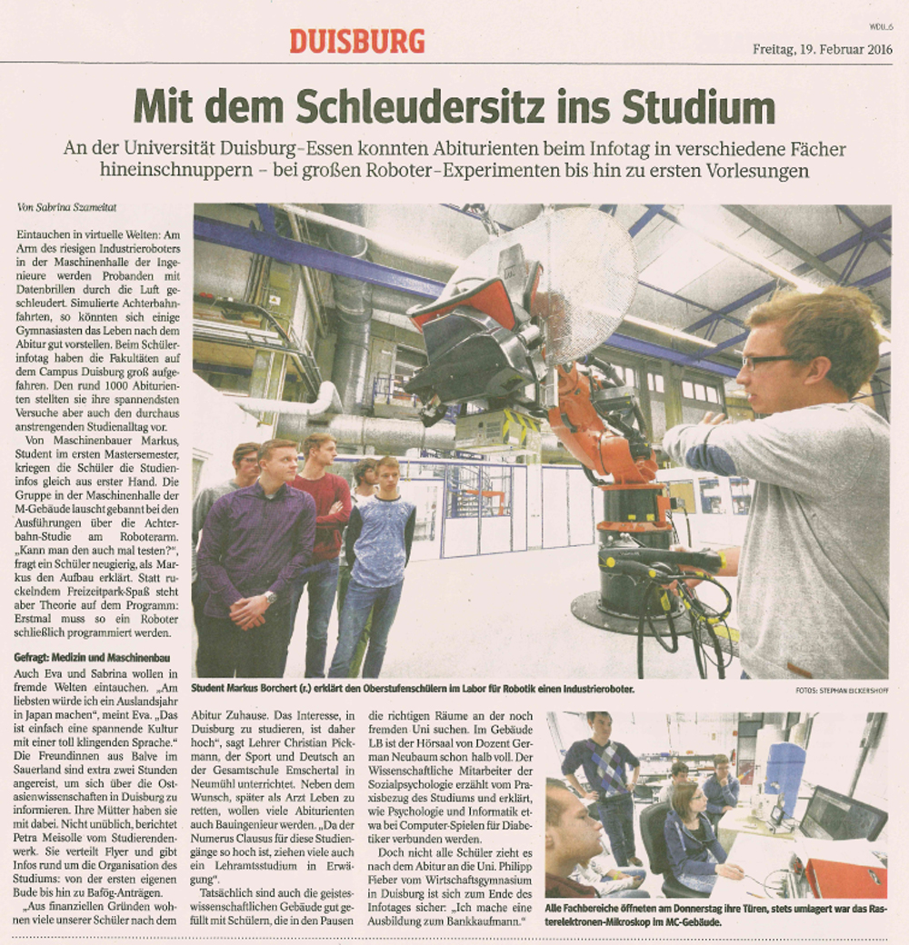 Ein Artikel zum Schülerinfotag findet sich in der WAZ Duisburg vom 19.02.2016. Für weitere Informationen zu unseren Projekten am physikalischen Bewegungssimulator sowie den Industrierobotern wenden Sie sich bitte an Herrn Röttgermann