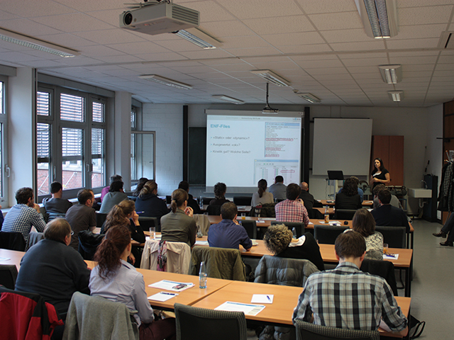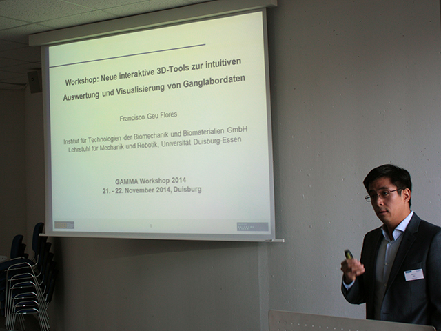 Die wissenschaftliche und klinische Arbeit von Laboren für instrumentelle Ganganalyse wird im deutschsprachigem Raum durch die „Gesellschaft für die Analyse Menschlicher Motorik in ihrer klinischen Anwendung“ (GAMMA) gefördert, deren Jahrestagung 2014 an der Universität Duisburg-Essen stattfand. Unter der Leitung von Herrn Dr. Raab vom Lehrstuhl für Mechanik und Robotik fanden sich am 21. und 22. November 2014 rund 50 Ärzte, Physiotherapeuten, Sportwissenschaftler, Physiker und Ingenieure aus Deutschland, Österreich, der Schweiz und den Niederlanden zur Diskussion von aktuellen Forschungsergebnissen und Fallstudien aus dem Bereich der instrumentellen Gang- und Bewegungsanalyse am Campus Duisburg ein. Die wissenschaftlichen Vorträge befassten sich sowohl mit den Herausforderungen der Ganganalyse im täglichen Forschungs- und Klinikbetrieb (Verletzungsprophylaxe, Scoreentwicklungen, Datenauswertungen) als auch mit Methoden und Technologien zur Verbesserung der klinischen Diagnostik (z. B. Inertial-, EMG-, Ultraschallmessungen; Muskelkraftberechnungen). Weiterhin wurde im PC-Pool der Fakultät für Ingenieurwissenschaften anhand der Software MobileBody® (ITBB GmbH) eine anwendungsorientierte Einführung in „Neue interaktive 3D-Tools zur intuitiven Auswertung und Visualisierung von Ganglabordaten“ gegeben und im Rahmen eines Empfanges innovative Technologien der Bewegungsanalyse und aktuelle technische Projekte aus dem Maschinenbau präsentiert.