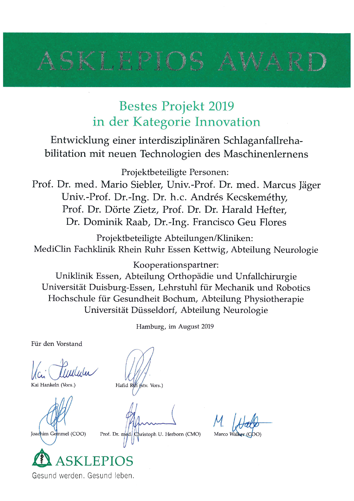 - Asklepios Award 2019 in der Kategorie „Innovation“ für das Projekt RehaBoard