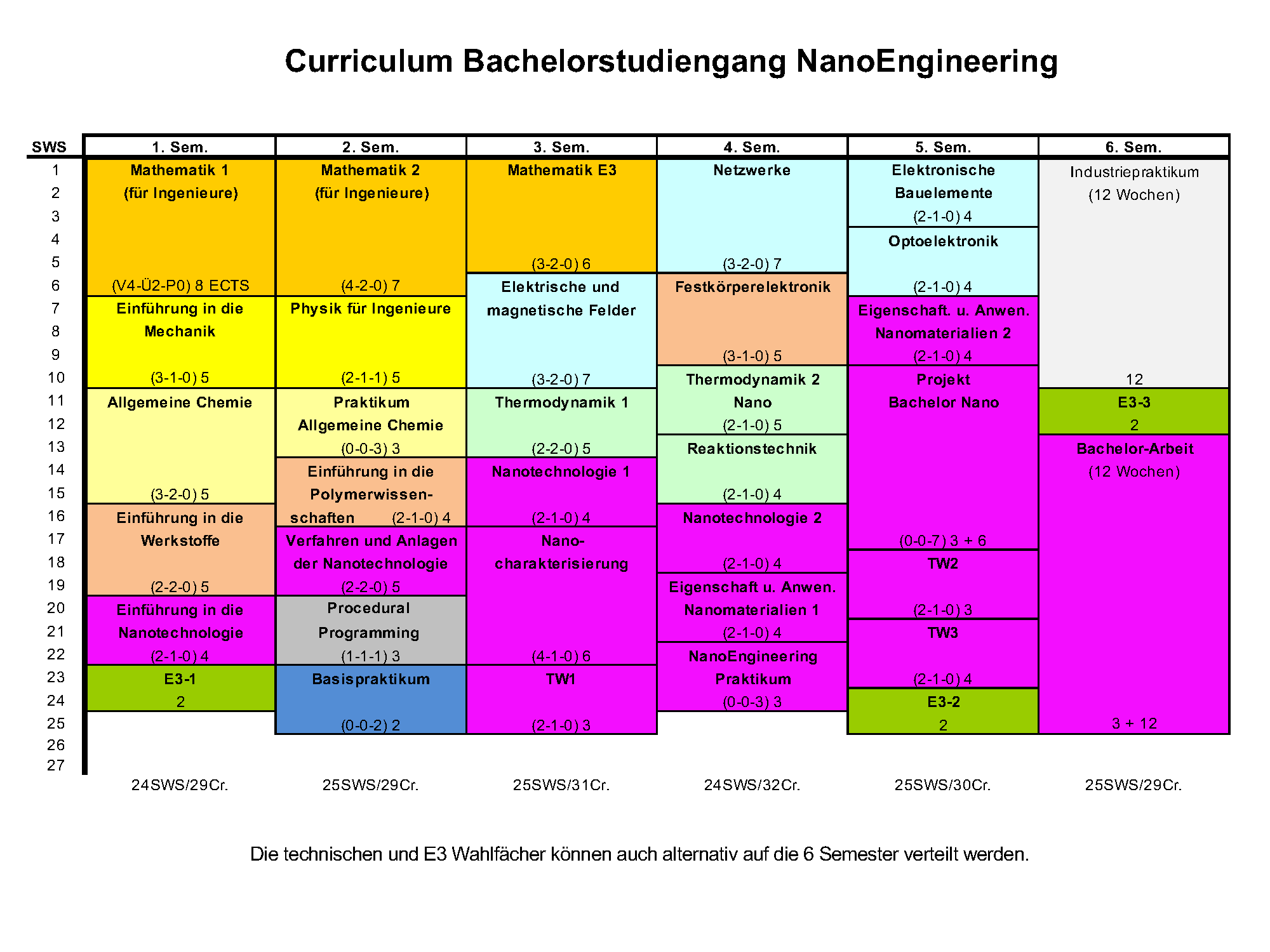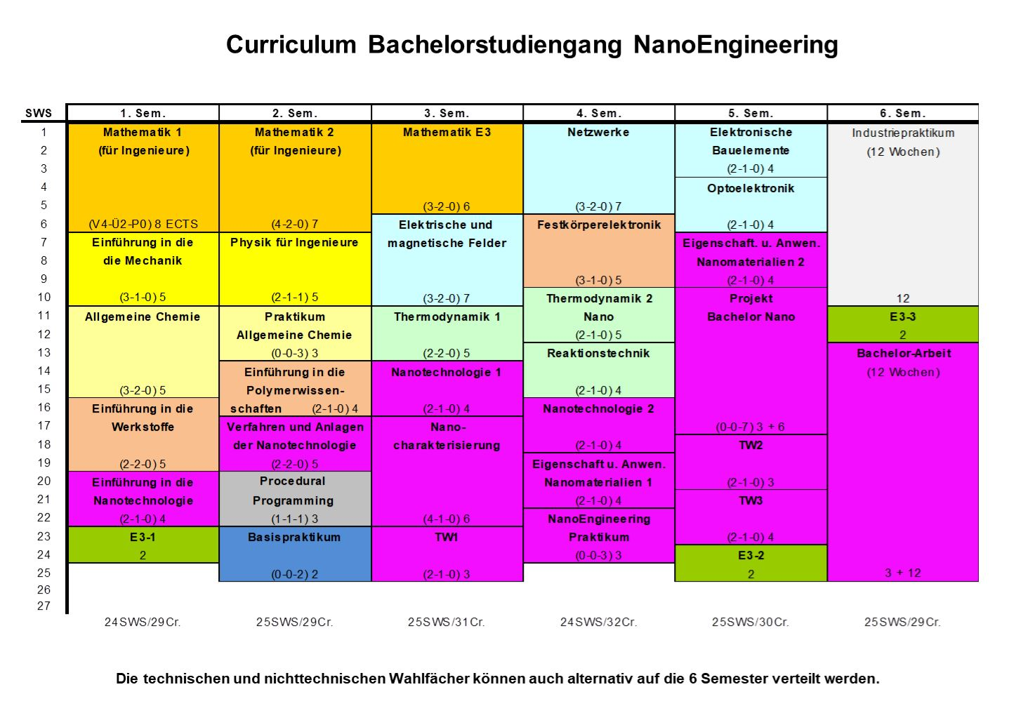 Im Bachelor-Studiengang NanoEngineering werden zunächst die grundlegenden Methoden der Mathematik und Naturwissenschaften erarbeitet, gefolgt von den ingenieurwissenschaftlichen Grundlagen. Parallel hierzu werden den Studierenden die Grundlagen der Nanotechnologie vermittelt. Aufbauend auf dieser breiten Basis findet anschließend eine fachliche Vertiefung und Spezialisierung statt. Daneben erwerben die Studierenden über das Modul Nichttechnische Wahlfächer auch Wissen außerhalb der Nanotechnologie. Durch ein mehrwöchiges Industriepraktikum gewinnen sie einen ersten Einblick in die Betriebsabläufe, in die Organisation und vor allem in die Sozialstruktur eines Unternehmens.