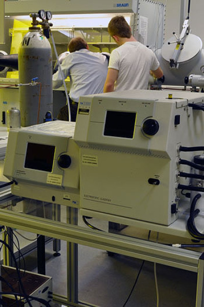 Nitrogen glovebox (MB 200 B, MBRAUN)A glove box is an area that is hermetically sealed and gas-tight to the surrounding laboratory. A defined atmosphere is maintained inside, consisting of inert gases such as nitrogen (or argon). A glove box is used to protect samples and materials from reacting with oxygen or water from the laboratory air.