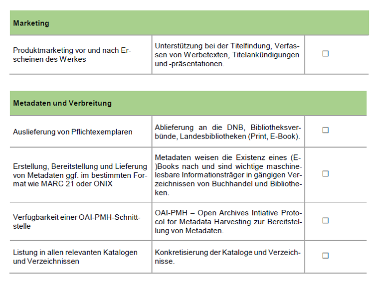 Die Checkliste bietet eine Übersicht über die Verlagsleistungen, welche in der Regel zu den Qualitätsstandards der Verlage zählen oder als optionale, zum Teil auch kostenpflichtige Zusatzleistungen angeboten werden. Die Checkliste kann als Grundlage bei Verlagsverhandlungen genutzt werden.