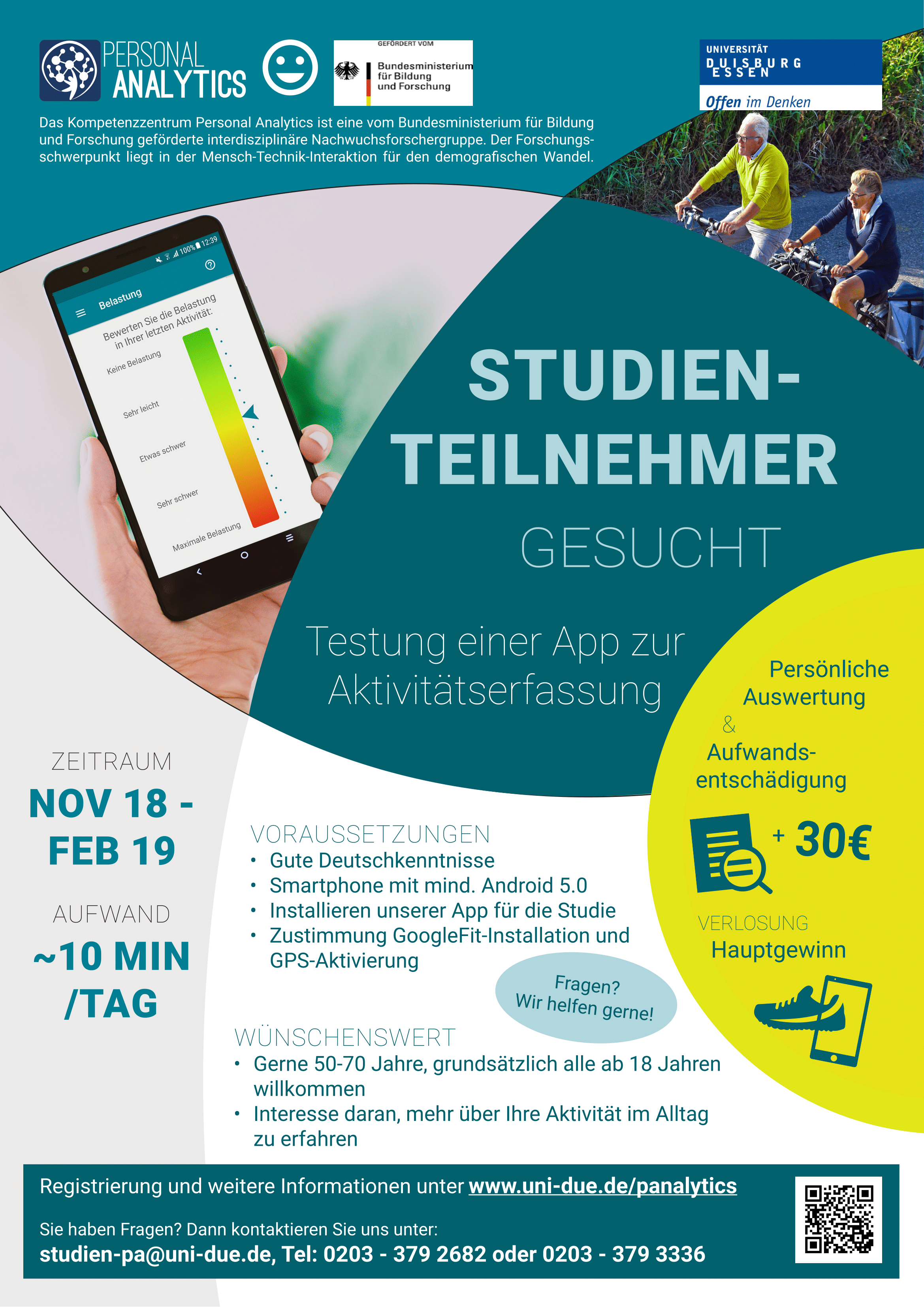 Die Studie beinhaltet zwei Präsenztermine (zwischen 30 und 60 Min.) und einen weiteren Termin zum Ausfüllen eines Online-Fragebogens (ca. 15 Min.) im Abstand von je einer Woche und die kontinuierliche Nutzung einer Schrittzähleranwendung im Alltag über 2 Wochen. Sie findet im Zeitraum vom 04.08.2015 – 24.08.2015 statt. Die Präsenztermine werden in Raum LE 309 am Campus Duisburg durchgeführt.