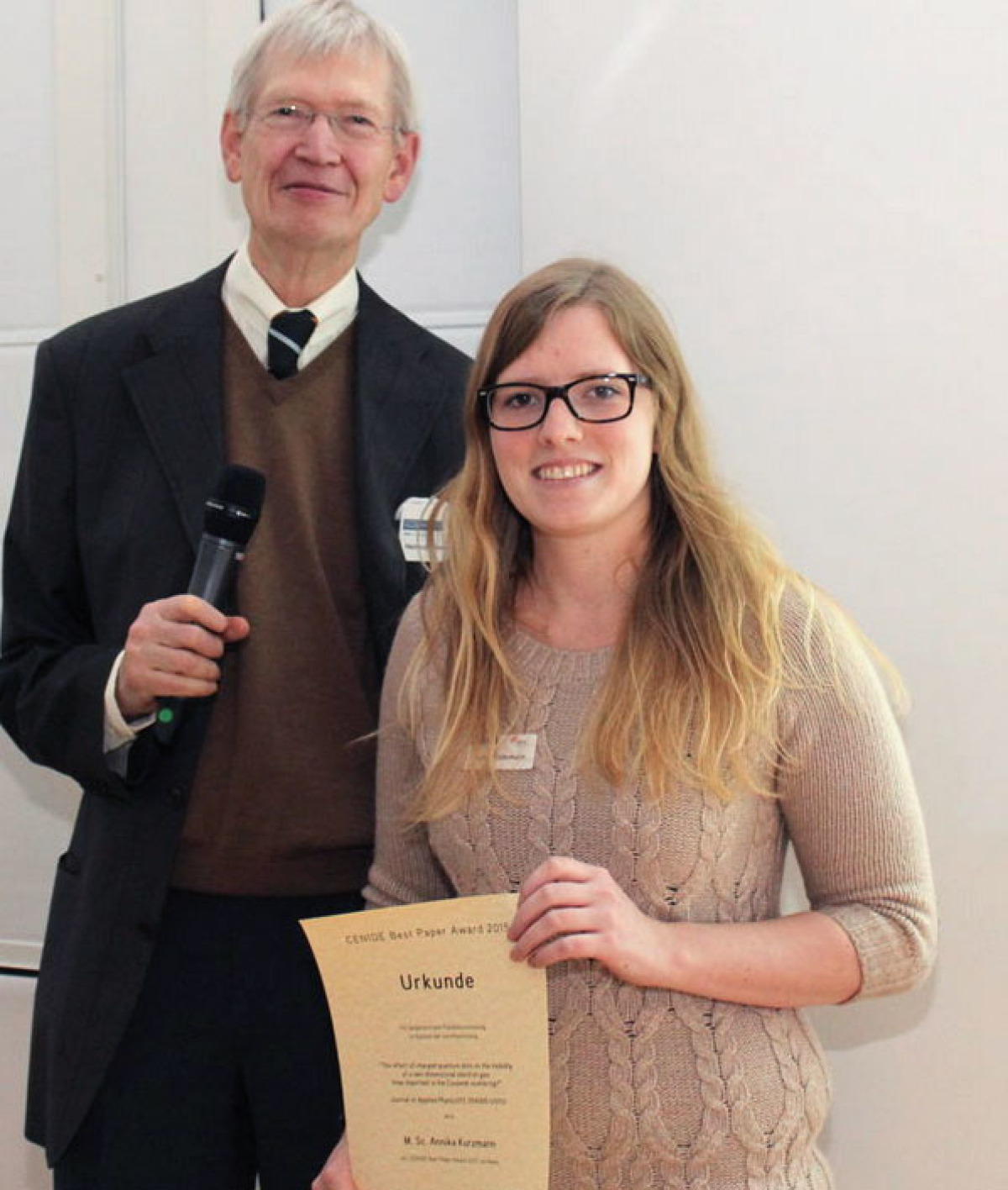 Von den über 200 wissenschaftlichen Veröffentlichungen, die jährlich auf dem Gebiet der Nanowissenschaften an der UDE publiziert werden, zeichnet CENIDE jedes Jahr einige wenige mit dem „Best Paper Award“ aus. In diesem Jahr wurde einer von nur drei "Best Paper Awards" an Annika Kurzmann aus der AG Lorke verliehen. Im Rahmen ihrer Masterarbeit hatte Annika Kurzmann untersucht, wie sich die Ladung einzelner Elektronen in sogenannten Quantenpunkten auf die elektrischen Transporteigenschaften einer benachbarten leitfähigen Schicht auswirkt.
