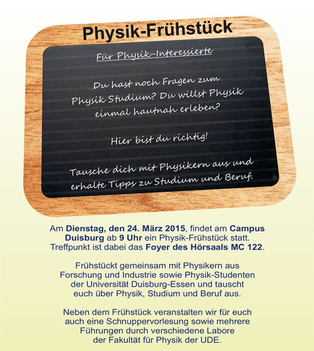 Am Dienstag, dem 24. März 2015, organisieren Physikstudierende aus der jDPG (junge Deutsche Physikalische Gesellschaft) am Campus Duisburg ab 9 Uhr ein Physik-Frühstück. Ihr könnt dann gemeinsam mit Physikern aus Forschung und Industrie sowie Physik-Studenten frühstücken und euch über Physik, Studium und Beruf austauschen. Neben dem Frühstück gibt es auch eine Schnuppervorlesung sowie mehrere Führungen durch verschiedene Labore der Fakultät für Physik.