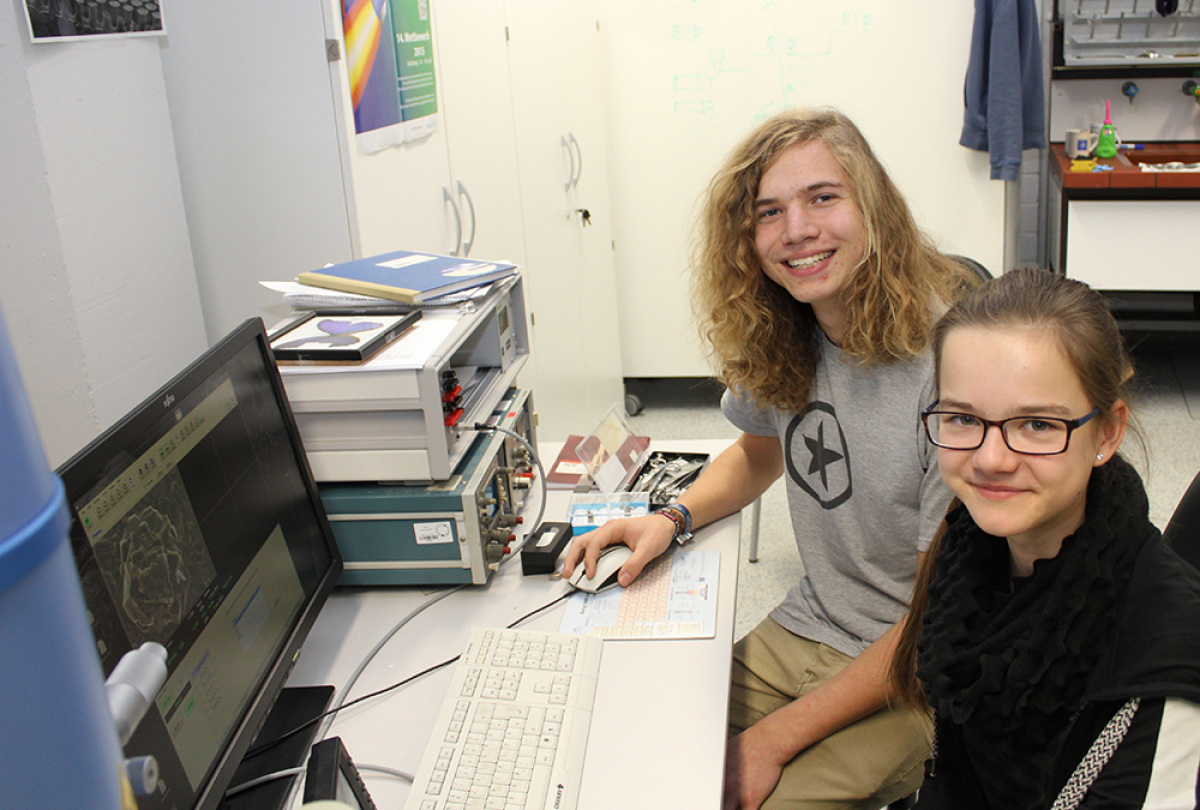 Die diesjährigen Bundessieger von Jugend Forscht im Fach Arbeitswelt Myrijam Stoetzer (14) und Paul Foltin (16) waren zu Gast im Evonik-Schülerlabor, das von der Fakultät für Physik und der Fakultät für Ingenieurwissenschaft betrieben wird. Sie hatten damit das eintägige Praktikum am Elektronenmikroskop angetreten, dass sie sich schon als Regionalsieger verdient hatten. Die Jungforscher sind ausgezeichnet worden für die Konstruktion eines Rollstuhls, der ausschließlich durch die Bewegung der Augen gesteuert wird. Innerhalb kürzester Zeit waren die Beiden im Schülerlabor in der Lage mit dem Elektronenmikroskop faszinierende Bilder aufzunehmen. Ein anschließender Besuch des Ionenbeschleunigers in der AG Schleberger konnte die beiden "Profis" noch beeindrucken.